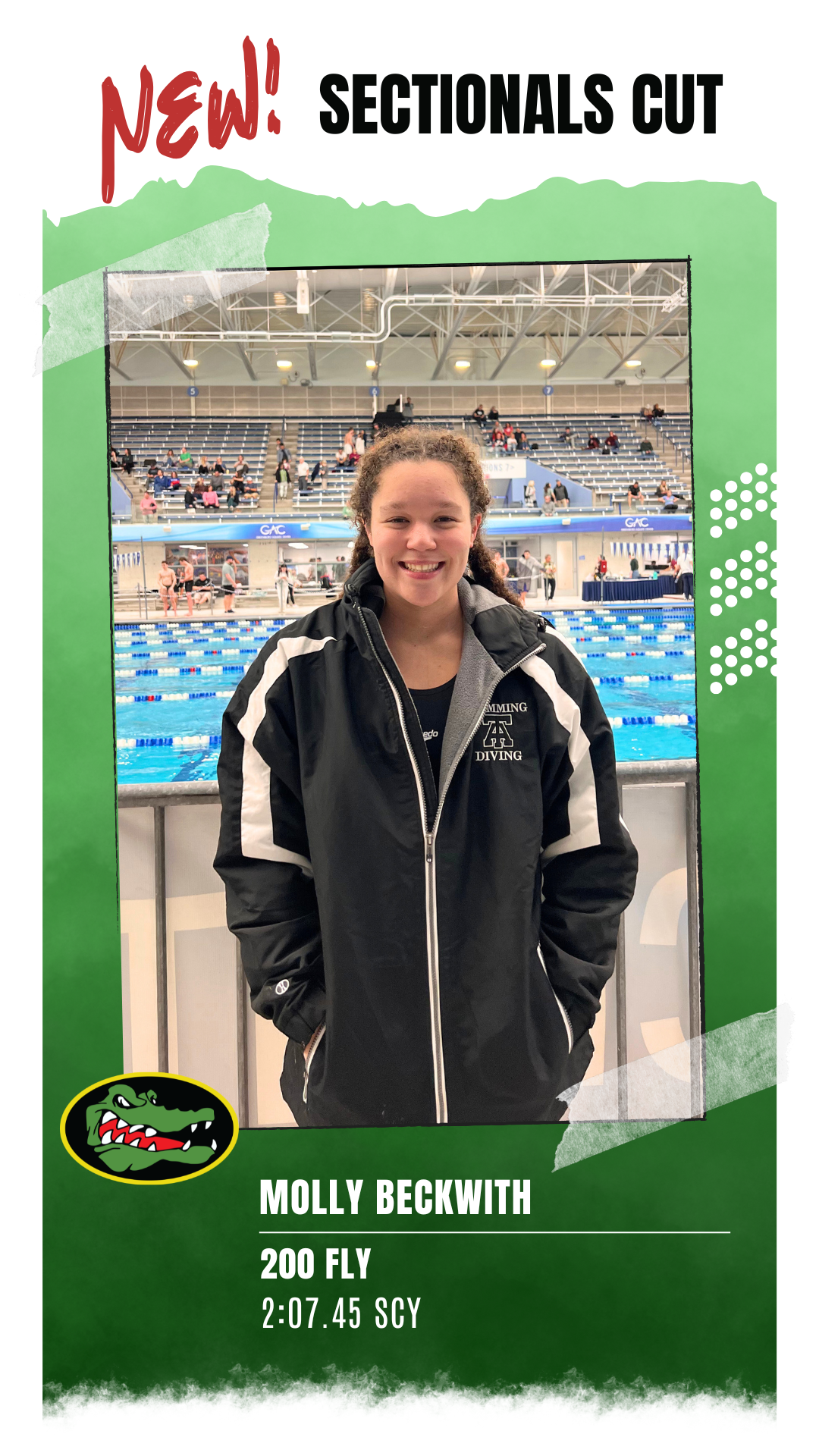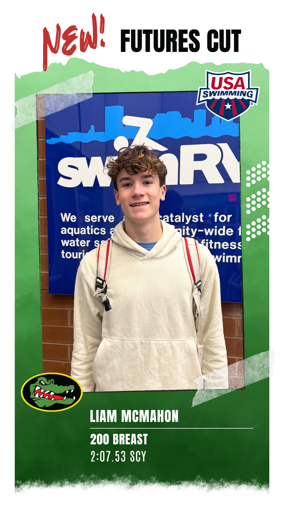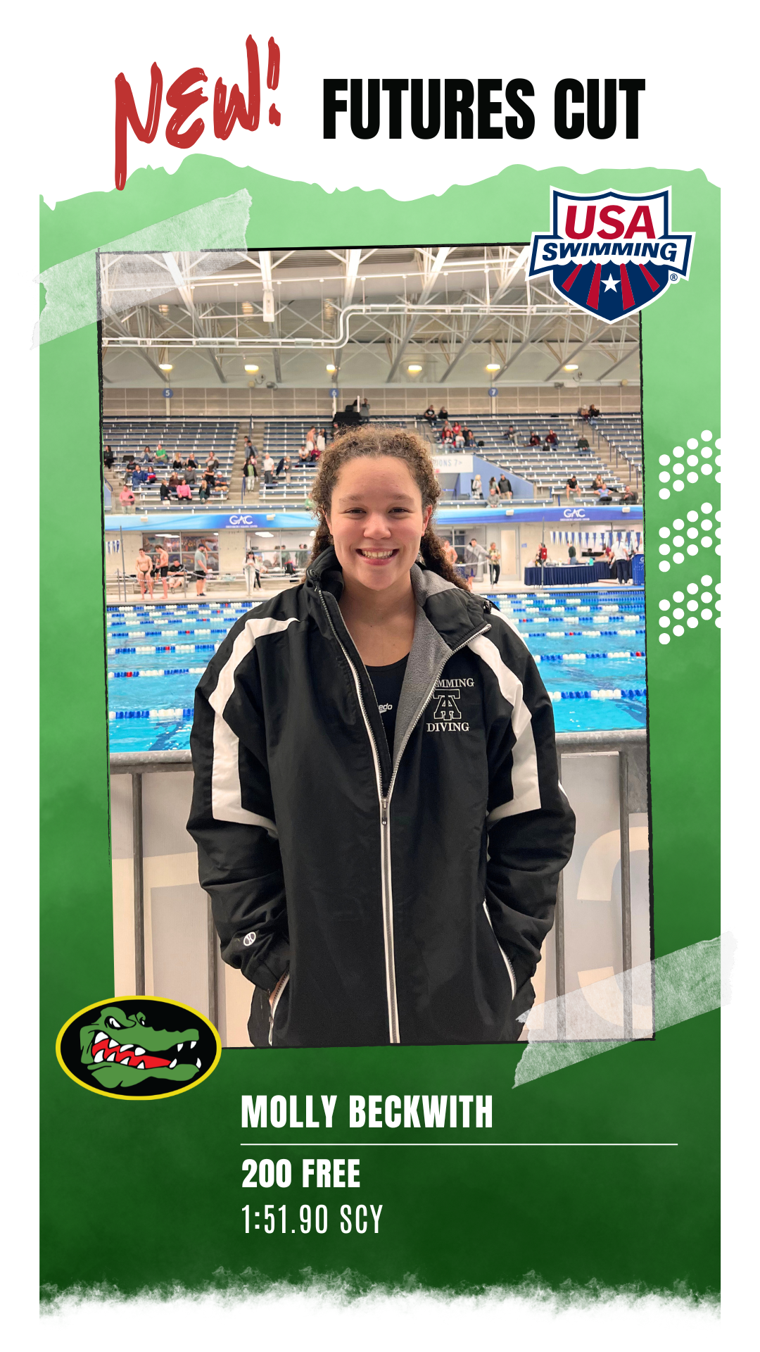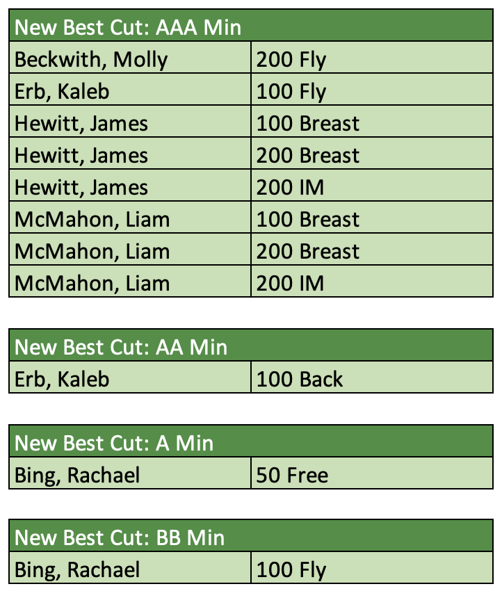 Liam McMahon achieved a Futures cut in his 200 Breaststroke, Molly Beckwith achieved a Sectionals cut in her 200 Fly and a Futures cut in the 200 Freestyle, and Kaleb Erb achieved a Sectionals cut in the 200 Freestyle. There were 13 movitational cuts achieved from BB through AAA as well. All additional motivational cuts are called out below