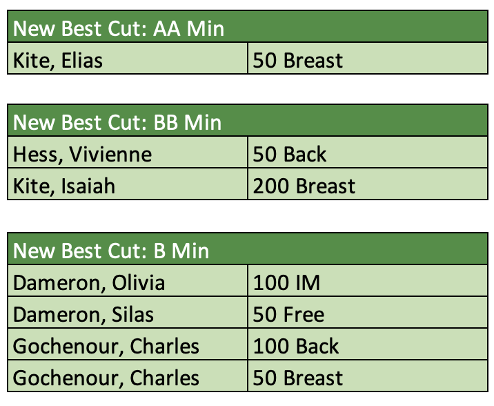 There were 7 new motivational cuts achieved from B through AA. Each of those swimmers and events are called out below. Great job everyone!
