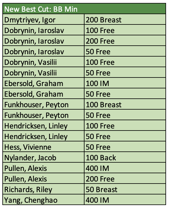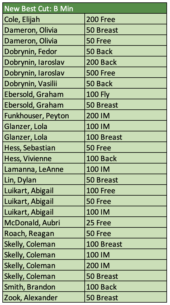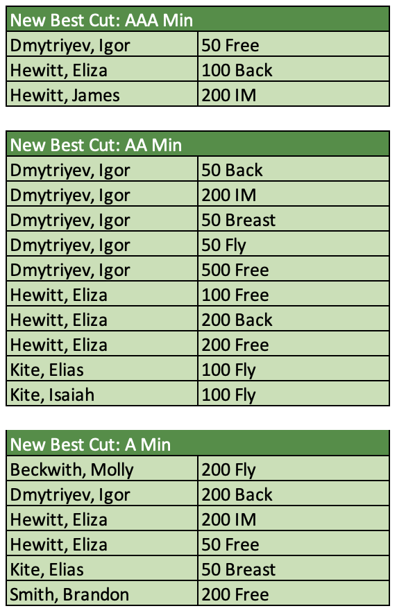 There were 64 new motivational cuts achieved from B through AAA. Those swims and swimmers are called out below. Great meet, everyone!! We hope you all had fun and were encouraged by your times over the course of the weekend.