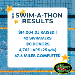 Our 2024 Swim-a-Thon (first-ever!!) has officially wrapped up, laps have been counted, and all the numbers are in! FIFTY-TWO of our swimmers worked hard at securing sponsorships to raise a total of $14,004.05 through our 190 donors! To say we are overwhelmed would be an understatement. The intial $10,000 goal was passed...and not in a small way! Whether it was 16 laps or 400, every single lap helped us toward our goal. Together our 42 swimmers completed a total of 4,762 pool lengths (25 yards) for a total of 67.6...