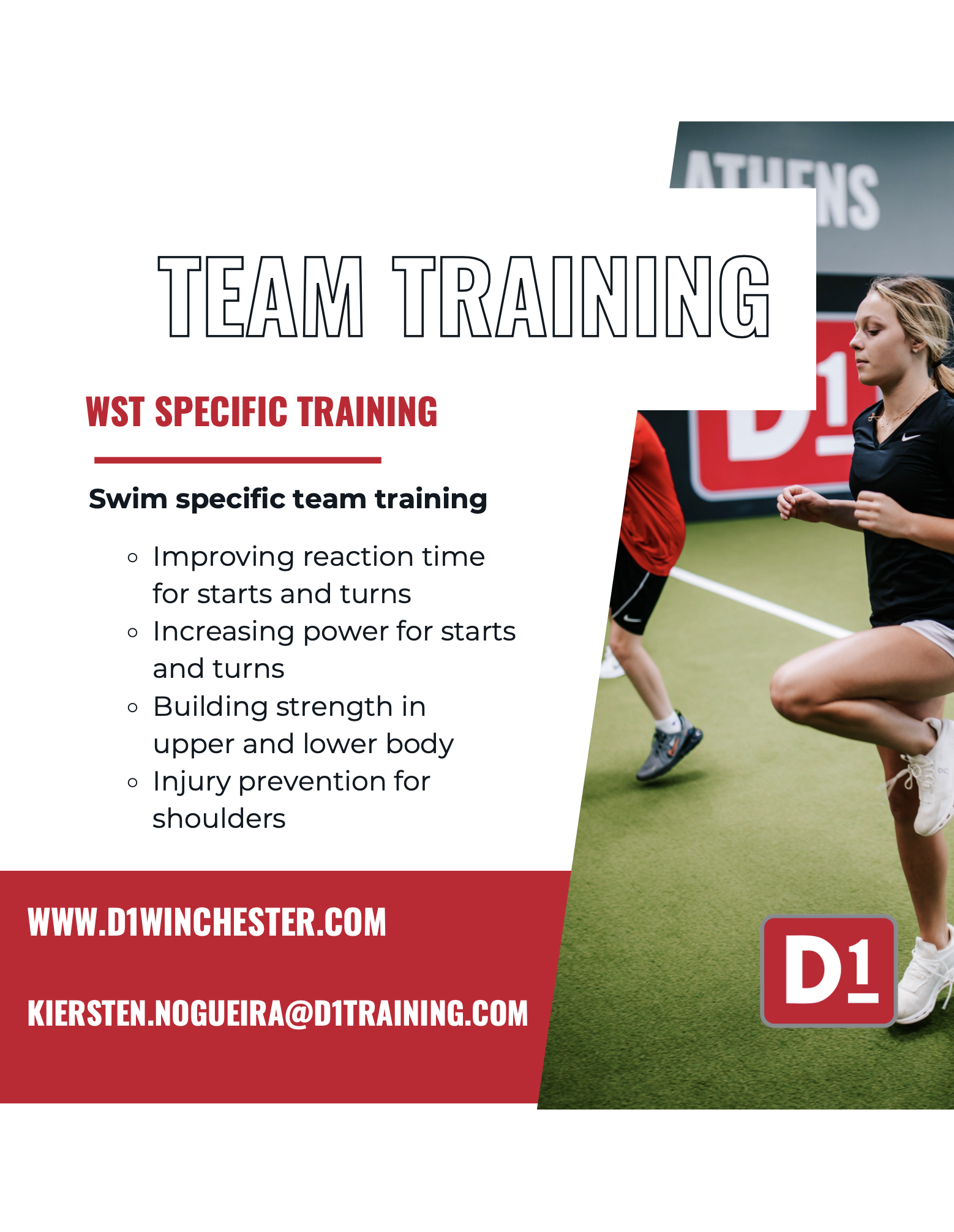 My name is Kiersten, and I am the General Manager for the new Athlete Focused training facility opening up in Winchester in just a few weeks called D1 Training. I had the great pleasure of working with several of the Senior, Gold, Silver, and Bronze swimmers earlier this year during their WST practice. I enjoyed getting to test each of your athletes on our force plates and designing a few dry-land workouts for the swimmers to start improving some of their deficiencies. During the dryland workouts we did pool side, I saw some great potential in several athletes and their eagerness to improve. To continue helping them progress, D1 has put together a special Team Training option for your athlete to come train in our facility. Our location's address is 178 Costello Drive, Winchester VA. Within our facility we have just under 5,000 square feet. Approximately 2,300 is our turf space for speed, agility, power, balance, and conditioning work. For our weight room we have 7 squat racks, DBs ranging from 5lbs - 85lbs, KBs, medballs from 5lbs - 50lbs, battle ropes, sleds, plyo boxes, and Assault fitness treadmills, rowers, and bikes. Our facility is set up the same way as Division 1 collegiate strength rooms are designed.