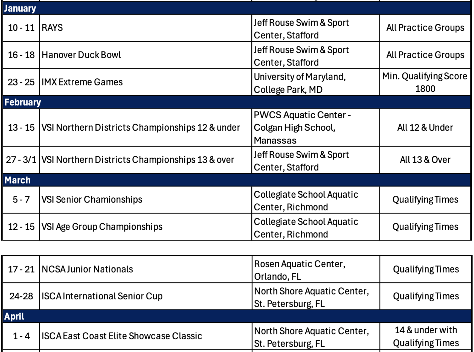 1 - RAYS Nutcracker Classic Mid Season Meet in Stafford, Dec. 4 to 7. If you have not signed up and you want to swim in the meet please reply to this email TODAY 11/24 and we will be able to add or adjust. If you can not attend all 4 days of the meet please add within the NOTES box what days you plans to swim.