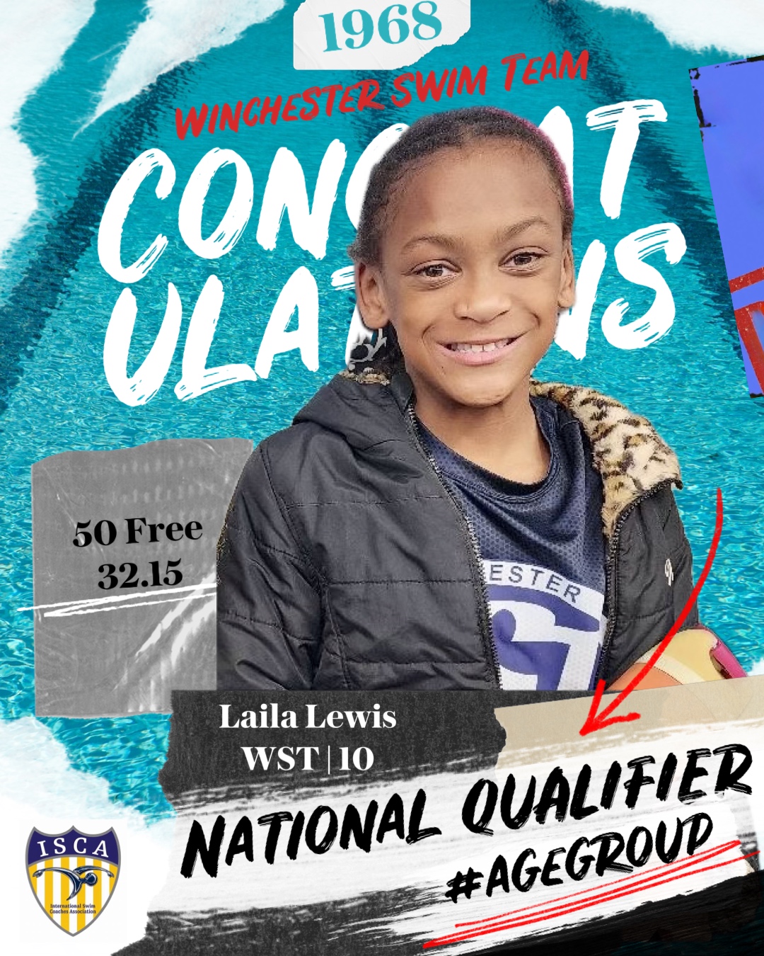 1 - Laila Lewis swam a 32.15 - 50 Free earning her a girls 10 year old qualifying time for the April 2026 ISCA ELITE Showcase classic meet in St. Petersburg, FL
