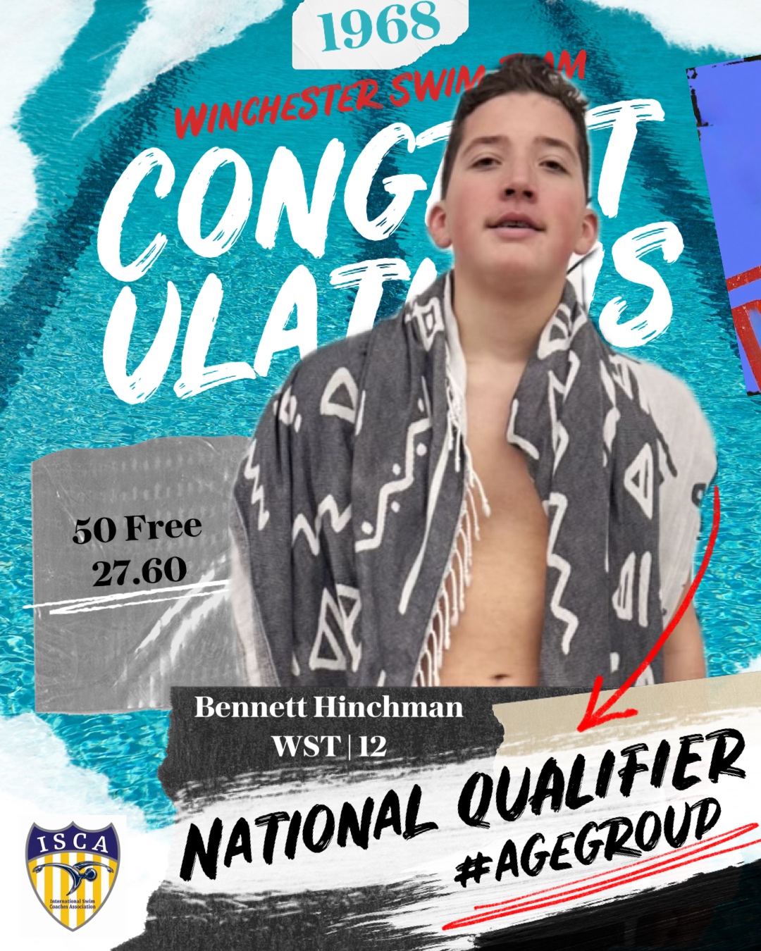 2 - Bennett Hinchman swam a 27.60 - 50 Free earning him a boys 12 year old qualifying time for the April 2026 ISCA ELITE Showcase classic meet in St. Petersburg, FL.