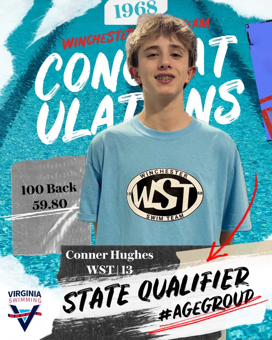 3 - Conner Hughes swam a 59.80 - 100 back earning him a boys 13/14 Virginia Swimming Age Group Championships qualiyfing time for March 2026.