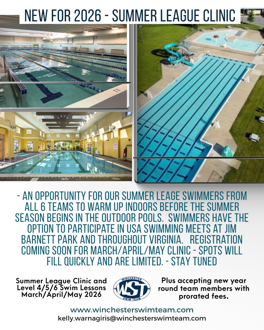 Please spread the word to friends and family members looking to take swim lessons locally. WST is partnering with Winchester Parks and Recreation to offer swim lesson by WST. This will elevate the program to a new level giving local community swimmers an opportunity to learn from very experienced coaches the skills to become great swimmers. Online registration for spring lessons will open soon. Please reach to [email protected] for additional information.
