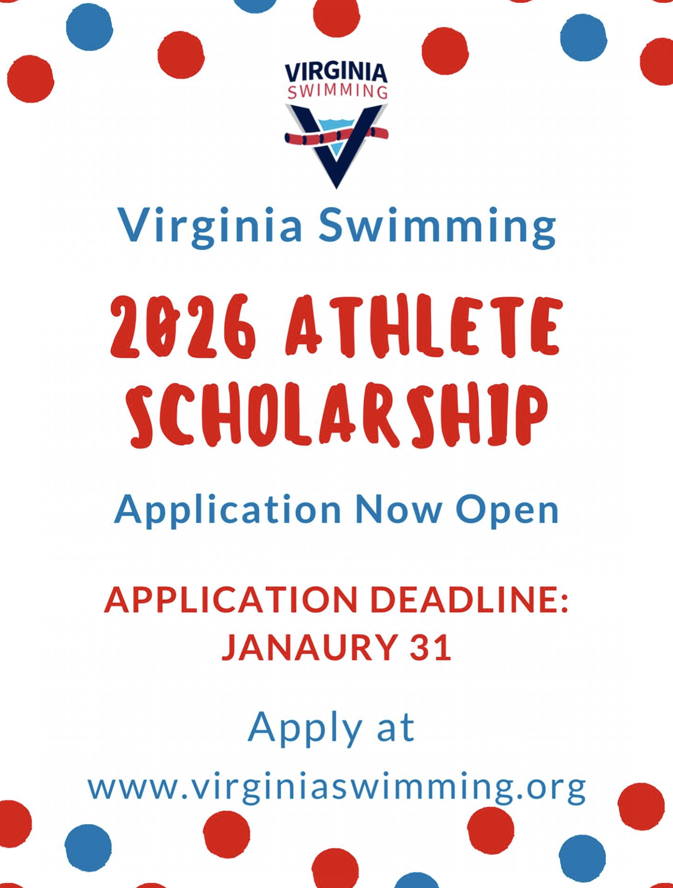 Calling all graduating seniors!! The 2026 Athlete Scholarship application is now open. The deadline to apply is January 31, 2026. Information can be found on the Virginia Swimming website.