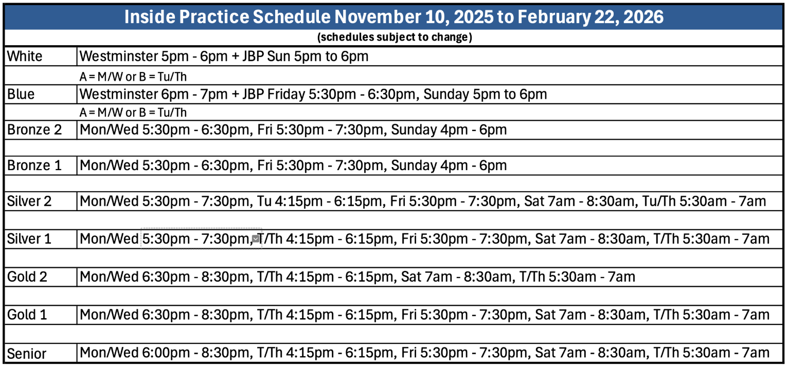 Sun. 11/30 - All practice groups should attend. White/Blue 5pm - 6pm, Bronze/Silver/Gold/Senior 4pm to 6pm