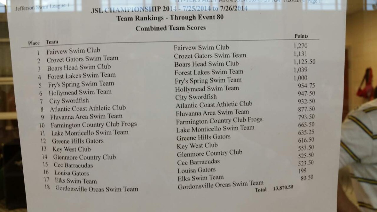 The 9-10 Boys joined the senior swimmers yesterday evening in an impressive session launching the team to 9th place overall with 877 points. Our swimmers saw big time improvements across the board which they have been working hard and tapering for. Highlights: Mike DiFazio dropped 2 seconds in the 50 backstroke, missing first place by .05 seconds. Hannah Brown dropped 3 seconds to break the 1:00 milestone in the 100 freestyle. The 13-14 girls relay dropped 10 seconds to place forth overall. Gus Jones finished third overall in the 50 breaststroke. Hoping to see more time improvements today!! -Coach Treavor
