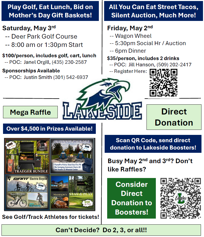 The Lakeside Booster Club is swinging into spring with our annual family dinner, golf tournament, and fundraising extravaganza the first weekend in May! The two-day event is packed with fun, food, and friendly competition to support our Lakeside student-athletes. Proceeds benefit the LHS golf and track teams by funding equipment needs, team-building opportunities, and college scholarships!