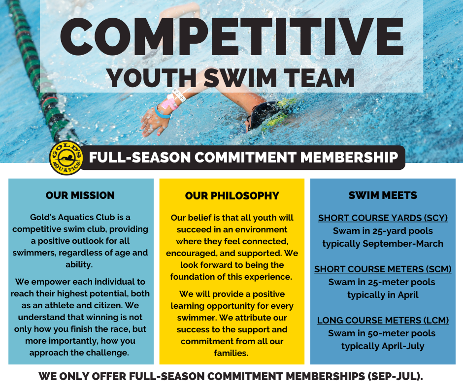 Gold’s Aquatics Club was founded in 2007 in Woodinville, WA. We started the team with 20 swimmers and one coach. Our oldest swimmer at the time was 12 years old and it was our vision to create a program that would highlight the benefits of a high-quality program while continually considering the needs of all our swimmers. We focused on having a team that took all facets of development into concern when forming our training groups. We considered the emotional and physical growth stages into account, to create a positive training environment for all.
