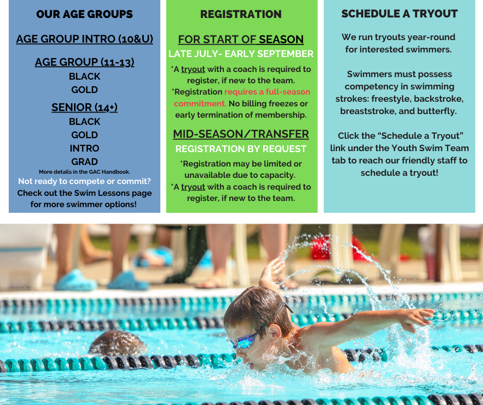 Our Senior program has three different paths so that we can continue to meet the needs of our swimmers at each training level. We have the Senior Intro Group, Senior Black, and Senior Gold options. Each training group has its time standard and attendance expectation. This is a busy time of life for our athletes, and we want to be able to meet them, where they are and assist in their commitment and goals. For some of our swimmers, it is fitness, for others, it’s focusing on attending national-level meets and college swimming.