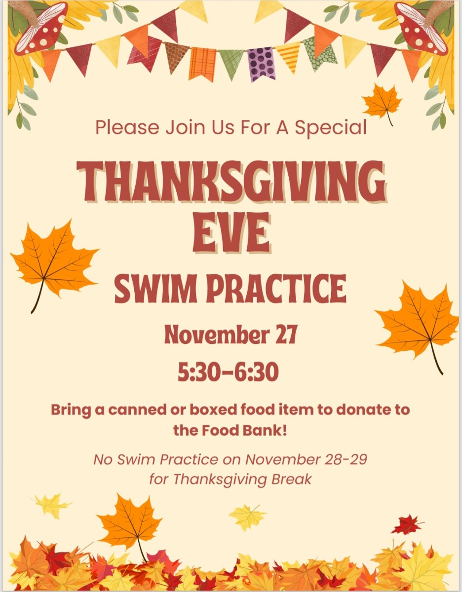 We will have a special Thanksgiving Eve swim practice on Wednesday, November 27th from 5:30-6:30pm.