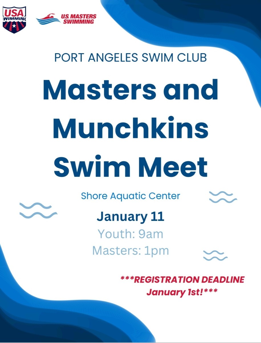 Our first annual Masters and Munchkins meet will be held on January 11, 2025. The youth will swim in the morning (9am), followed by the adults (1pm). Registration deadline is January 1st.