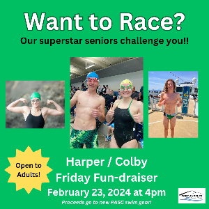 Mark your calendars! On February 23rd, our senior superstars are challenging everyone to race... adults included! Challengers can choose what stroke Harper or Colby have to swim and can add up to 5 different handicaps. Join us for an amazing fun-draiser that is guaranteed to go down in the books! Proceeds will go towards much needed swim gear in the team closet. The flyer has been sent out via email and will also be available on the pool deck. A special thank you to Harper and Colby for being so...
