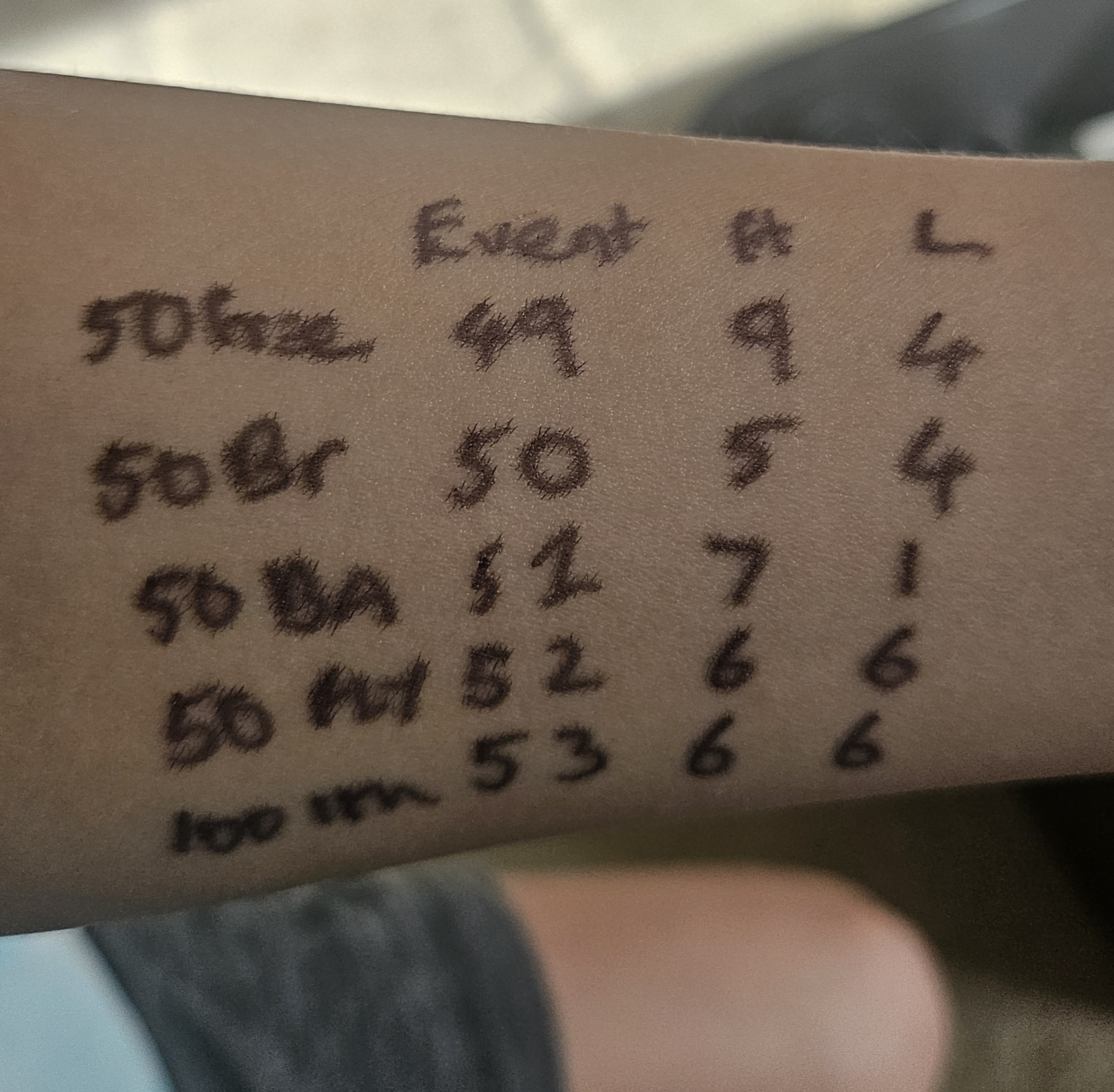 Event, Heat and Lane. Coaches will hand your swimmer a slip of paper that shows the events they will participate in, along with the corresponding heat and lane. It is helpful to write this information on your swimmers arm using a Sharpie pen to help them remember, like this: