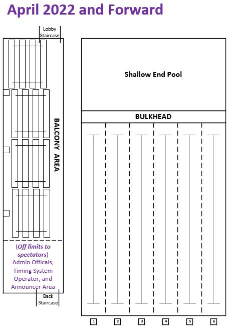 - Upstairs on the balcony, near the starting blocks is now being used for the swim meet and is closed for all spectator traffic. Please enter and exit the upstairs from the lobby staircase. If you are spectating and have a volunteer shift coming up, we ask that you still please use the lobby staircase and come down on deck to check in for your job.