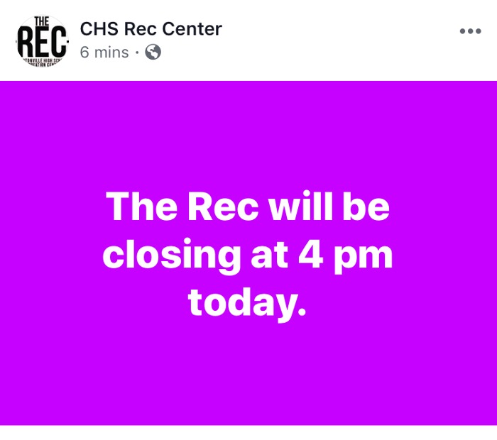 the Rec Center is closing 4pm due to the winter weather. All practices of all levels are cancelled. Please note, this will not impact the schedules for later in the week. Please resume all normal scheduled practice days tomorrow!!