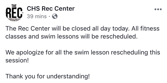 Please note that due to the Rec’s closure, there will be now swim practice today! Enjoy your snow day, stay safe!