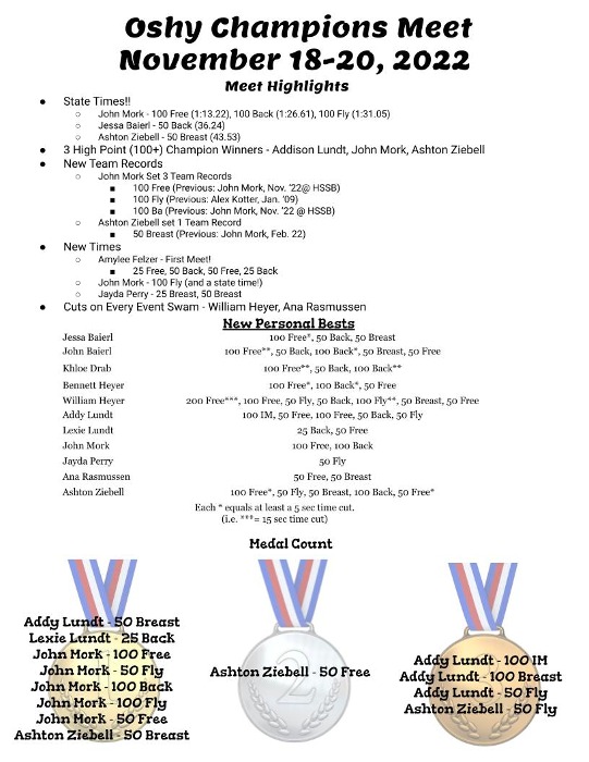 The Oshy Champions Meet exceeded all of our expectations! This was a super fast pool and CAST swimmers showed up to compete. Five new Single Age State Cuts, 3 High Point Champions (Earned more than 100 place points), Four New Team Records for the 9-10 year old boys, and HUGE time cuts from John Baierl, Khloe Drab, and William Heyer. John Mork took 1st place in all but one of his events and many swimmers fought hard to shave off time from their own personal best times. Shout-out to Amylee Felzer for doing awesome at her first meet! Ashton Ziebell also got to swim with The Champion Giles Smith who the Oshy Swim Club brought in for this event. The coaches are super proud of the hard work, fast swimming, and team spirit from all of our swimmers! Go CAST!