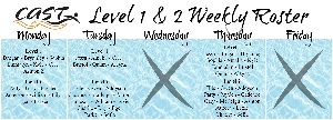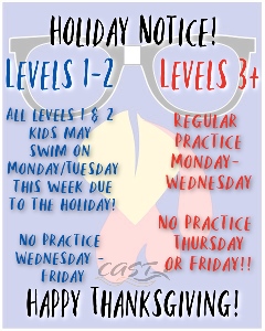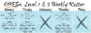 **Updated** To allow for the correct ratio of children to coaches- Level 1 and Level 2 parents were asked to declare which days their children would practice. The agreed weekly dates for the Winter 2018 CAST swim season are shown!! If one of these days falls on a snow day, holiday, or cancelled night you are welcome to come on the other 2 days that week. If your days need to change for whatever reason, please contact your coaching staff asap!