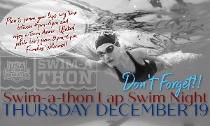 As you may know, our Swim-a-thon fundraiser is taking place right now!! This Thursday is the day set for lap swimming for your goals! What: Lap Swims for Swim-a-thon Fundraiser When: Dec. 19, 2019 from 4pm - 6pm What if your swimmer cannot make that date? We understand that there is so much going on this time of year- If you cannot make this date, please bring your packet to any practice before Christmas Break and ask a coaching staff member to count for you!! Simple, but please make sure...