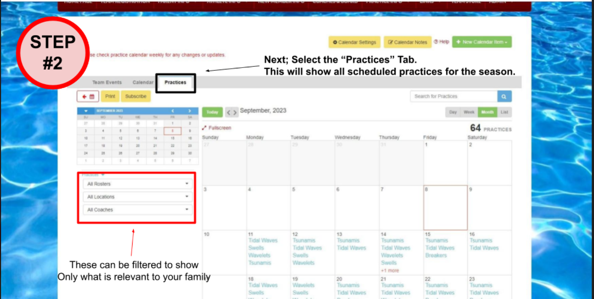 Please see the attached photos for screenshots to access practice schedules if you are having difficulty.