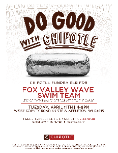 Hi Wave Families, Spring Season starts TODAY! We are so excited to see you at practice and for a Meeting with the Coaches. Always remember to check the calendar frequently for any schedule changes. Click Here for the website calendar. Our website is a wealth of knowledge, if you have questions please check that first! To kick off the Spring Season we will be having our first fundraiser TOMORROW! Please join us at Chipotle on Calumet Street ONLY! See attached flyer for more details. Go Wave!