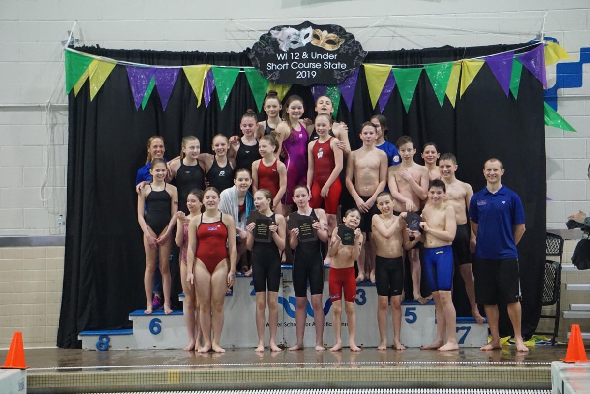 This past weekend our Madison Aquatic Club State Team competed at the Wisconsin State 12 & Under Championships at the Walter Schroeder Aquatic Center in Brown Deer. We had our largest 12 & Under state team ever with 49 swimmers competing. Our swimmers earned best time after best time and brought home the Wisconsin State 12&under Championship trophy! Here are the results.