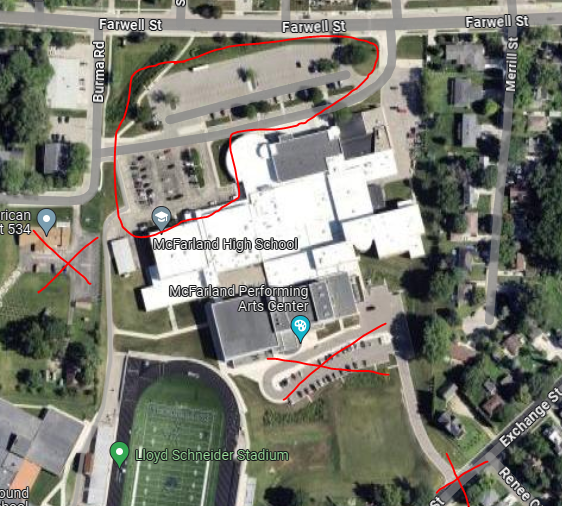 - Enter high school GYM doors from north parking lot on Farwell Street.