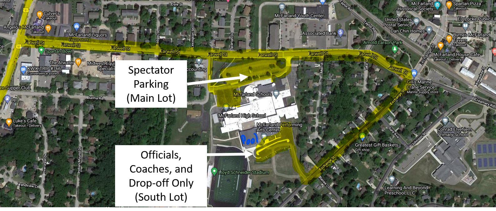 Parking Map - The south lot parking is for Coaches & Officials only (drop-off is allowed). Spectators please park in the main lot off Farwell St.