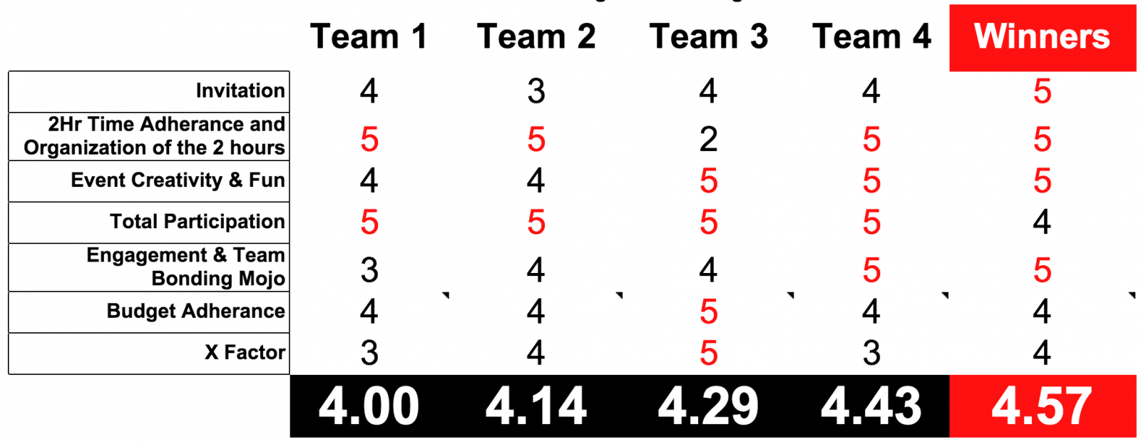 The image below is how the voting was calculated. We will announce the winner at our movie lunch. If your group is the winner, each individual must be present [unless your have an excused absence] to win your share of the bacon!