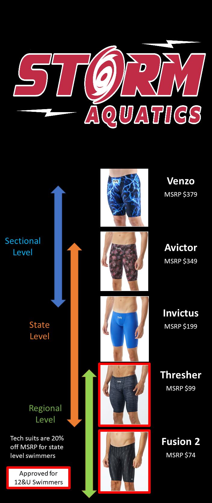 While a team suit is not required, it is strongly recommended for competition. Storm’s team suit is available for purchase at Simply Swimming and can be viewed on the Swimsuit Guide on the website.