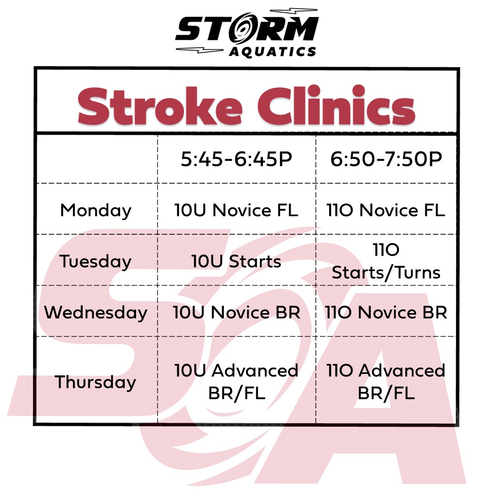 A quick reminder that Monday will kick off 4 days of stroke clinics at SP West. These are open to Storm swimmers planning to swim this spring, Storm swimmers taking the spring off, swimmers from other club teams, swimmers from rec teams, whoever! Find details on our event page.