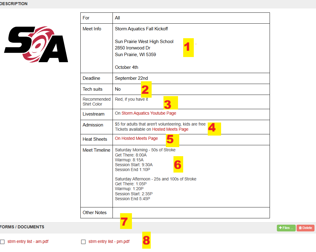 6) The meet timeline. Each group has a specific arrival time, typically 15 minutes before their warmup begins. That's when we take attendance and adjust relays accordingly, so it's a big deal for them to be there on time.