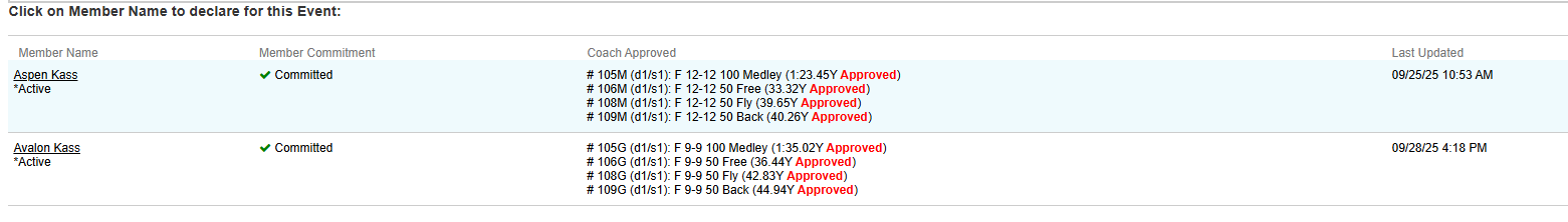 If there isn't an entry list, or if you want to look before it's published, go to where you declared your swimmer for the meet. Once we've selected events for them, they'll populate beside your swimmer's name.