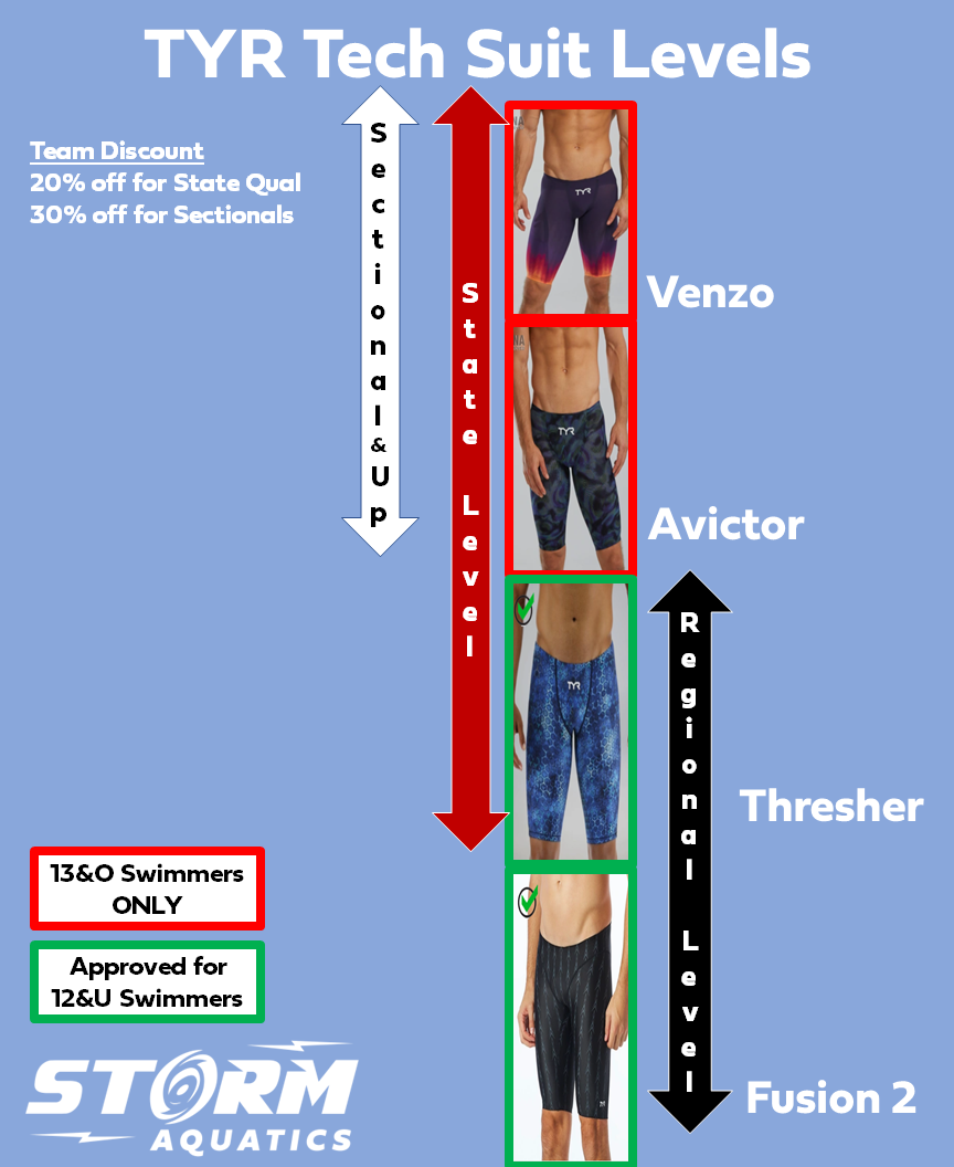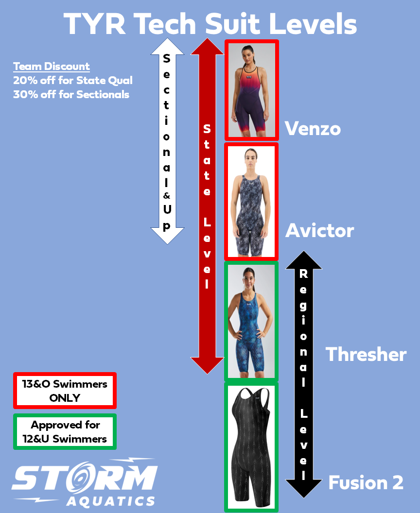 For high level competition or championship level meets, we have several options in suits. You'll find them categorized by age group. Suits are recommended by age and ability, and you should consult the coaching staff before purchasing.