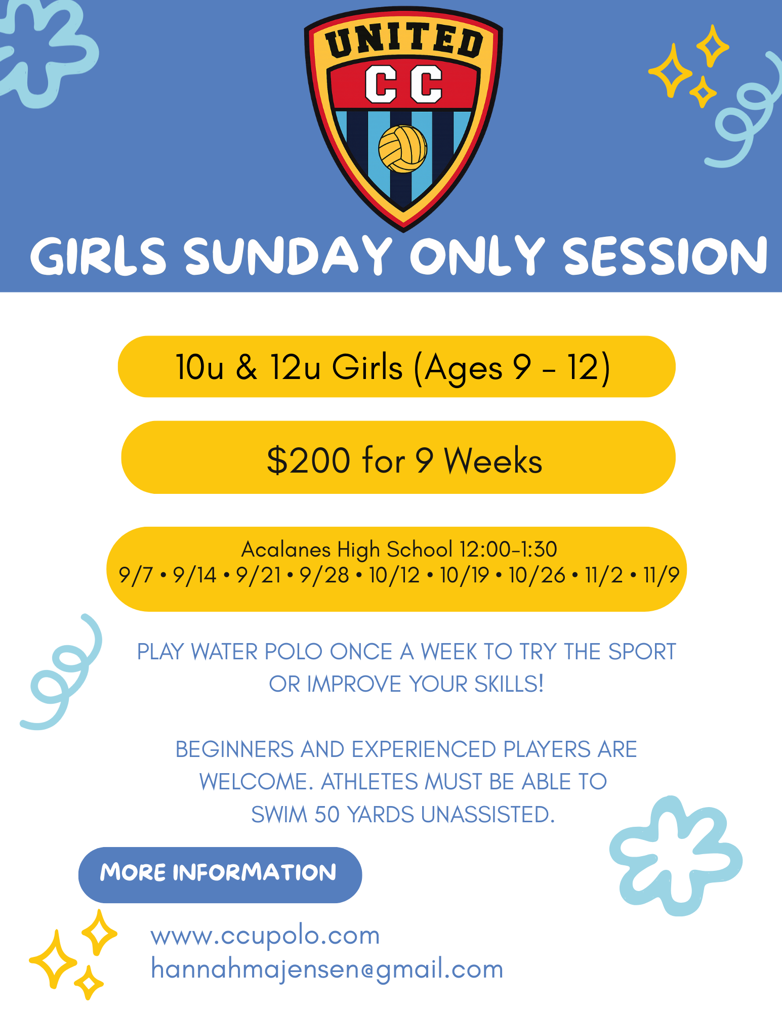 We are looking to expand our 10u & 12u girls age groups and will be offering a 9-week Sunday Only Session. Beginners and experienced players are welcome, and athletes must be able to swim 50 yards unassisted. We look forward to growing our girls program, so please share the following flyer and information with friends!