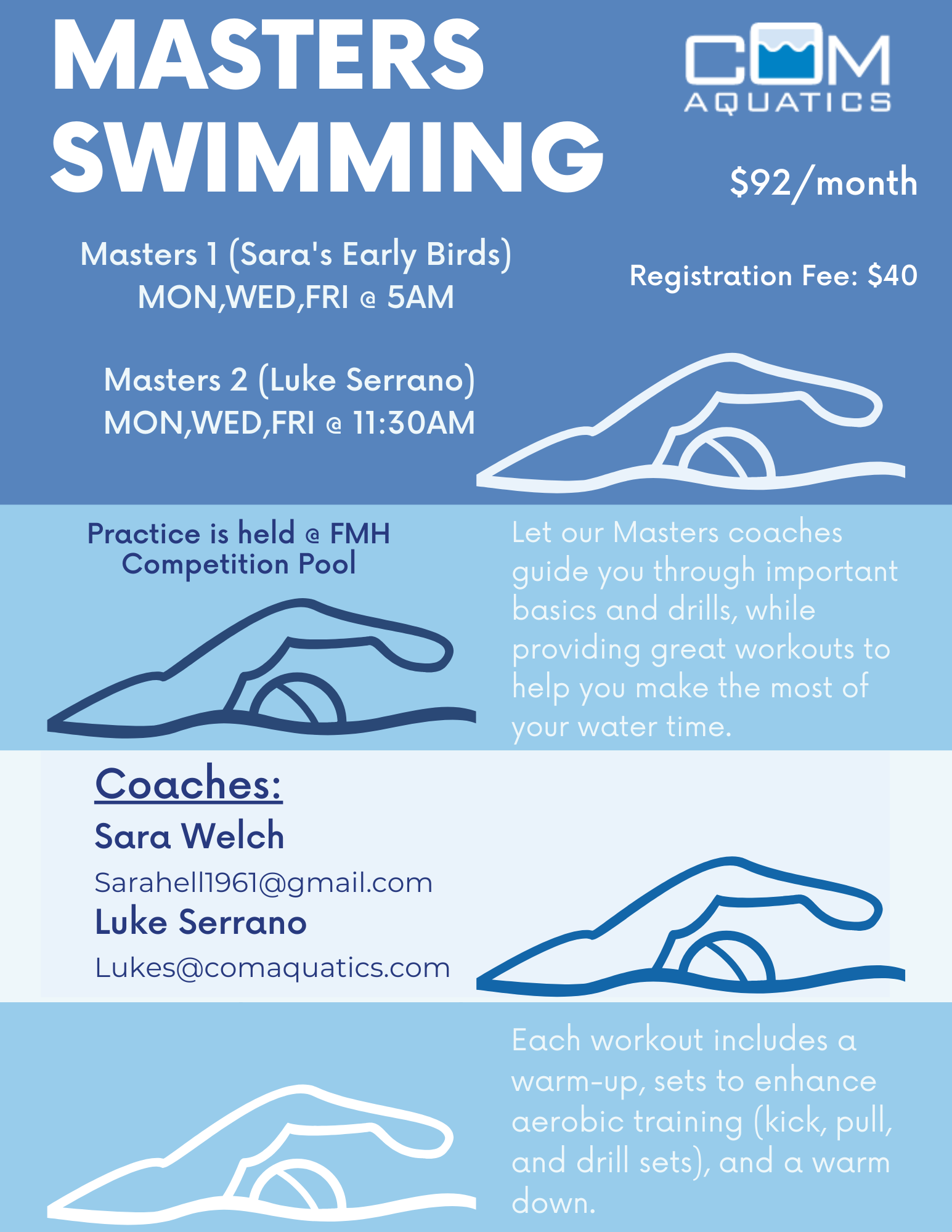 Our Masters swim team is dedicated to leading structured swim workouts to swimmers of varying ability levels to improve their swimming by developing better technique, fitness, and endurance. It is a great way to not only improve your swimming, but meet new people. Come join us!