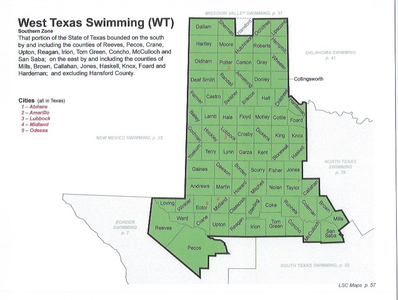West Texas Swimming, Inc (WTSI) is one of 59 Local Swimming Committees (LSC) with responsibility under USA Swimming to govern the sport of swimming in the West Texas area. WTSI is a part of the Southern Zone of USA Swimming and incorporates that portion of the State of Texas bounded on the south by and including the counties of Reeves, Pecos, Crane, Upton, Reagan, Irion, Tom Green, Concho, McCullock, and San Saba; on the east by and including the counties of Mills, Brown, Callahan, Jones, Haskell, Knox, Foard, and Hardeman; and excluding Hansford County. wtsi-territory