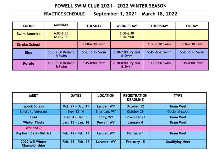 Blue Group dryland 5:30-7:00, Purple Group dryland 6:30-8:00.