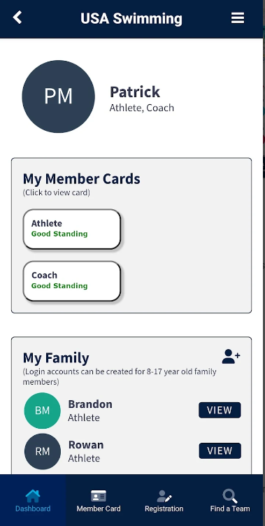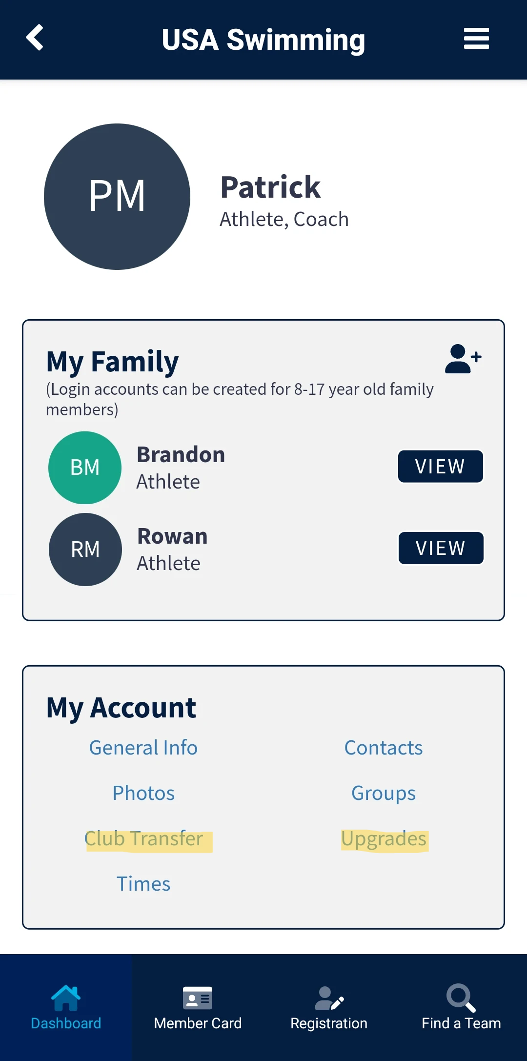 Transfers - To transfer any membership (athlete or non-athlete), please initiate your transfer using the option in your USA Swimming membership portal. (see first app screen)