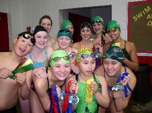 With only 17 swimmers at the meet the Marlins were 2nd, only outscored by perennial power KING. Several Marlins were victorious in more than 1 event. Often times the victories were in new meet records! Bindi Pedersen and Jennifer Domanowski each won 4 events. Bindi earned titles in the 50 & 100 fly, 200 IM, and 100 breaststroke. Jennifer won the 100 & 200 fly and 200 & 400 IM. Hannah Peseau was also a multiple winner in the 100 & 200 back, and 200 free. Christina was also a 3 time winner, winning the 100 back, 200 free, and 200 fly. Christina also had 3-2nd place finishes. Other victors included: Morgan Ginnis in the 50 free, Spencer Girard in the 200 IM, and Hannah Taylor in the 200 breaststroke. Marlins scoring points for top 8 finishes included: Melody Coleman, Kyle Libra, Mel Lofton, Jeffrey Lozensky, Sarp Orgul, Karoline Schaufler, and Andrew Winquist.