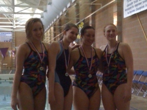 The Marysville-Pilchuck High School Girls stood on the brink of history after 11 events at the Wesco 4A District Meet at Kamiak High School on Saturday Nov. 6th. Going into the 12th and final event they were tied with Snohomish at 391 points, with Kamiak lurking only 10 points back at 381. Fortunately the Tommies had the powerful 400 free relay of Jewel LeValley, Karoline Schaufler, Melody Coleman, and Hannah Taylor up and ready to take on the challenge. The relay, in spectacular fashion, won the final event of the day sealing the victory for Marysville. It was a great team effort as 11 swimmers and 2 divers contributed to the scoring. The 2 divers Maryssa and Roma and Leah Mullen-Gaffney scored points in 1 individual event, and along with the 400 free relay participants Rachel Hartmeyer, Melody Travis, Ava Commissariat, Amanda Collins, Amber Flynn, and Nicole Reynolds each made top 18 and scored in 2 individual events. Thanks to strong performances, Hannah Taylor, Jewel LeValley, Karoline Schaufler and Rachel Hartmeyer will be swimming individual events at the state meet. The 3 relays will also compete with the Mighty Melodys, Coleman and Travis inserted in them.