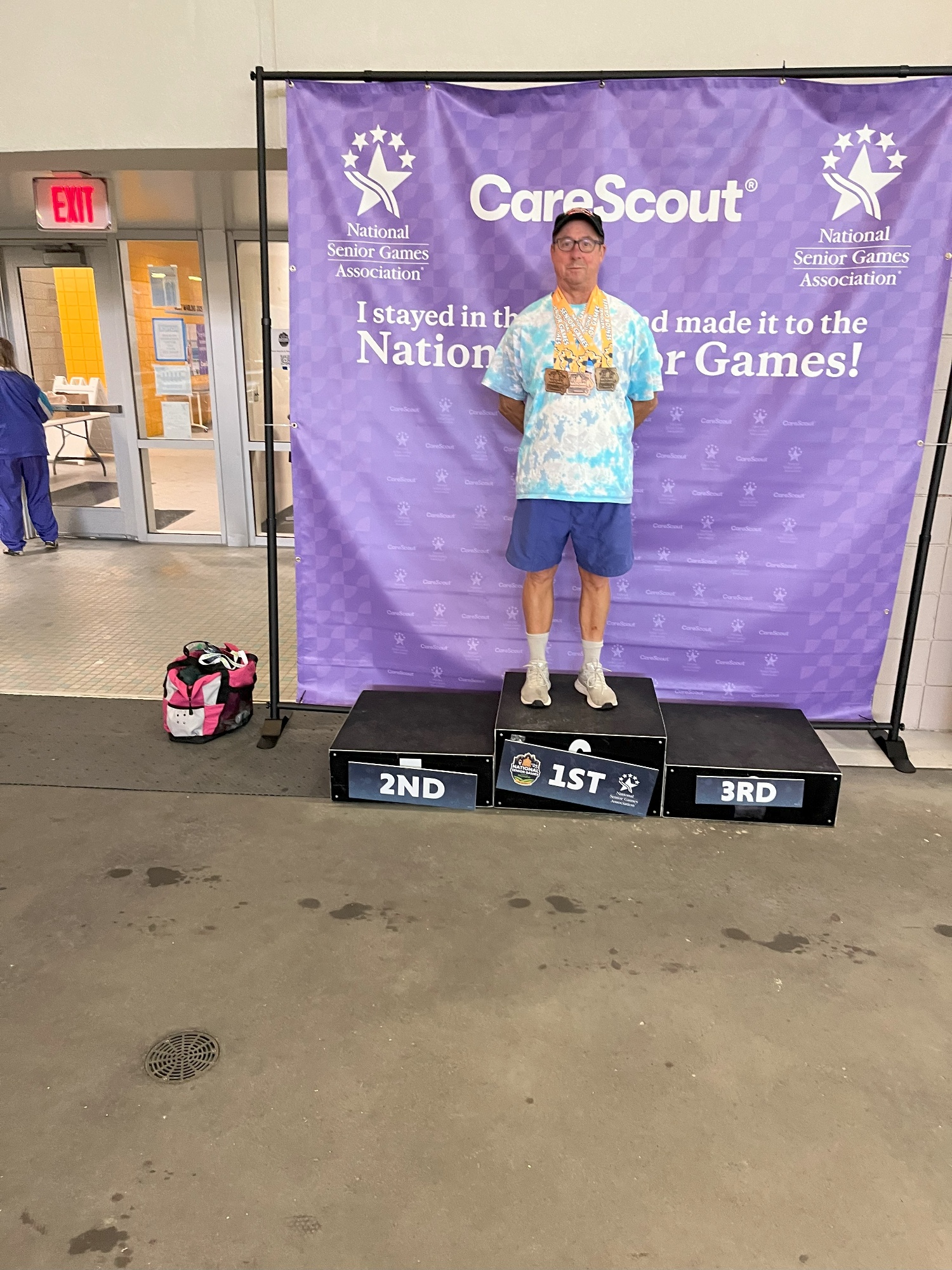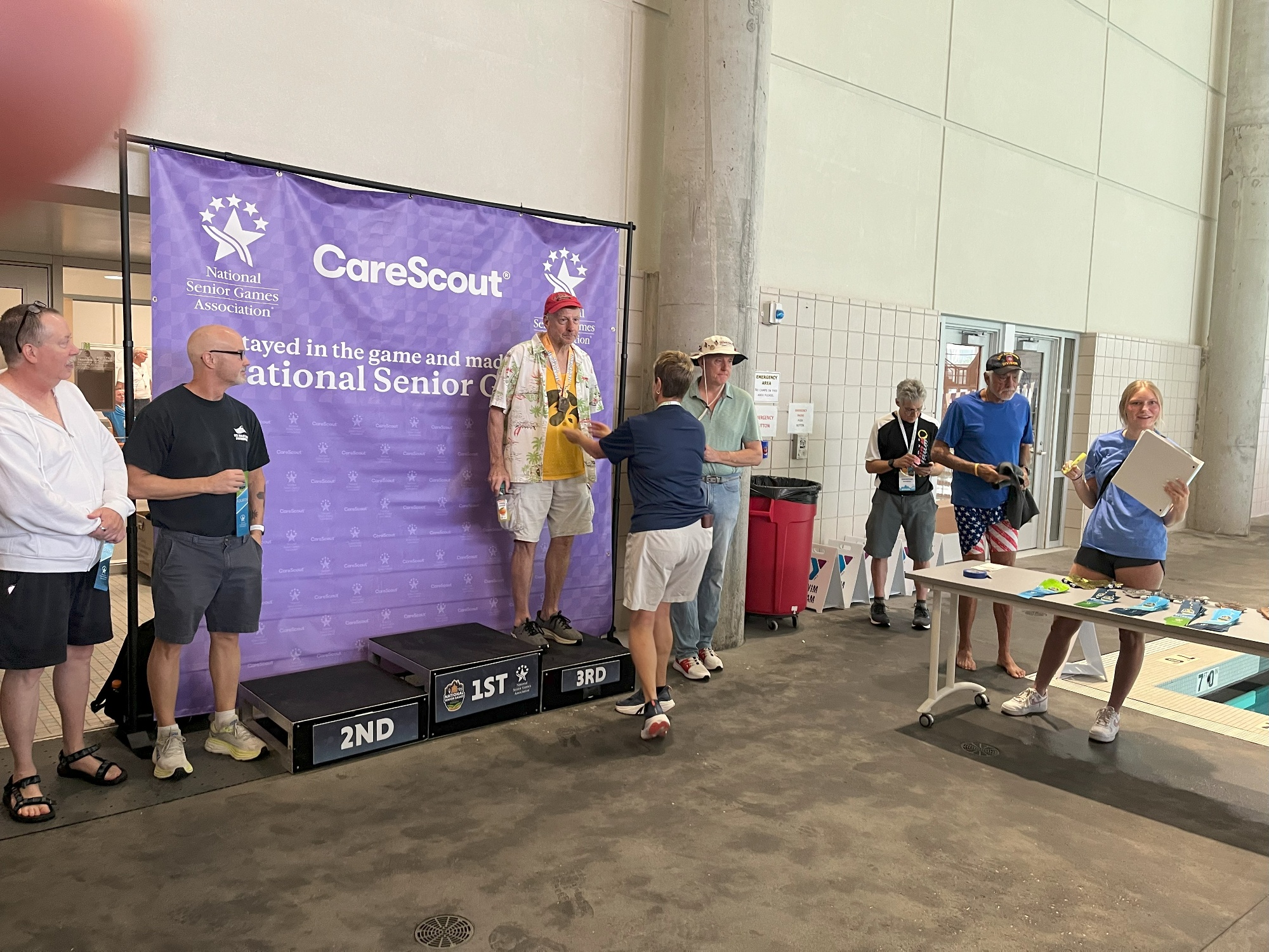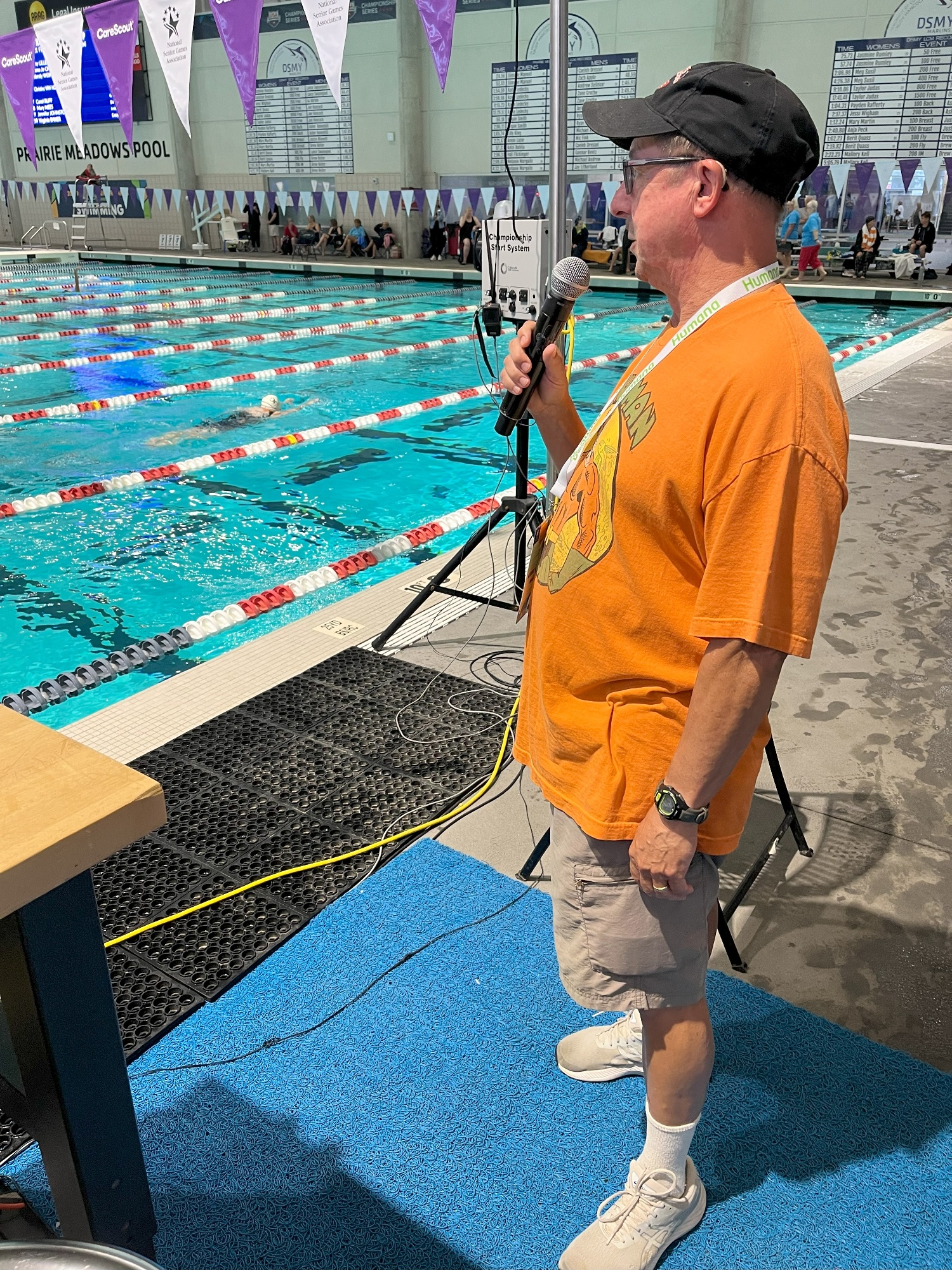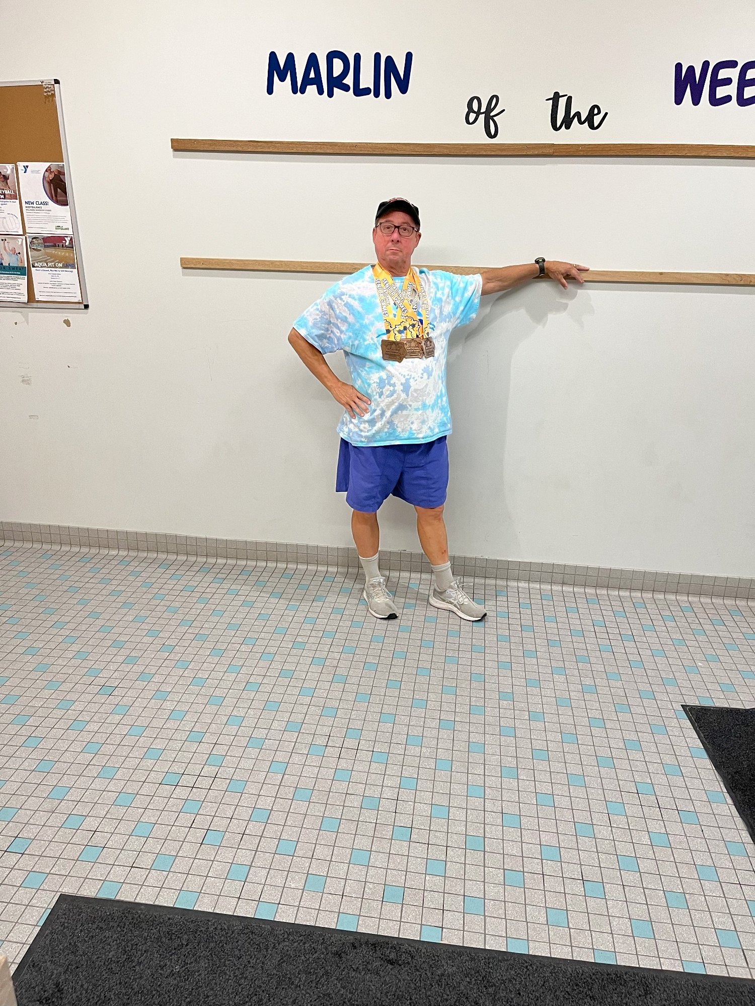 Kirby Schaufler, (The Mighty Marlins Swim Club Coach), swam at the National Senior Games Swimming Championships, (Also known as the Fat Old Man Olympics) in Des Moines Iowa the weekend of July 25-28. Kirby took 3rd in the 400 and 200 IM, and the 200 backstroke. Kirby also took 5th in the 500 free and 7th in the 50-butterfly. Kirby’s friend, Wayne Huebener, also took a 3rd in the 500 free. Far in the past, Kirby and Wayne helped the Grinnell Pioneers College Swim Team to 6 consecutive conference Championships in the late 1970’s and early 1980’s. Kirby was also the announcer for the 70 and over sessions of the meet, and by the end of the meet was know as “Golden Throat”!