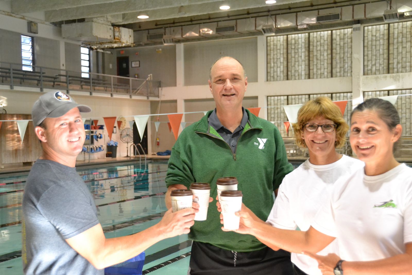 Our Coaches are more than just awesome coaches . . . they are friends too. (As long as the team manager remembers that they need coffee in the morning.) Coach Russ, Coach Joe, Coach Andie, and Coach Martie at an early morning practice during our 2016 Fall Swim Retreat.