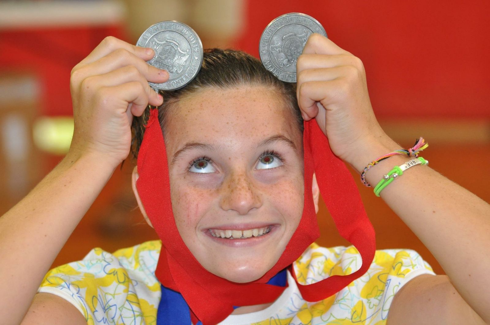 Mackenzie Brown has been working really hard using her swim medals to make her Mickey Mouse impression.