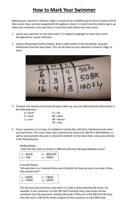 4. Write the event numbers your swimmer will be swimming that day at the meet on their hand. You may want to use a sharpie marker because it will hold up better in the water. Writing the event numbers helps your swimmer remember what events they are swimming and what event number to listen for during the meet over the loudspeaker. When you get to the meet you will need to get a hold of a heat sheet to be able to write their specific heat and lane for each event.