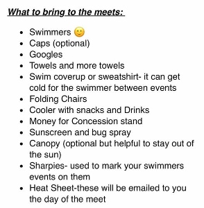 Swim meets are a great family experience. There is a place where the entire family can spend some time together. Listed below are some very in-depth guidelines geared to help you through your first couple of meets. It may seem a little overwhelming, but the details are specific to give you a good idea of what to expect.