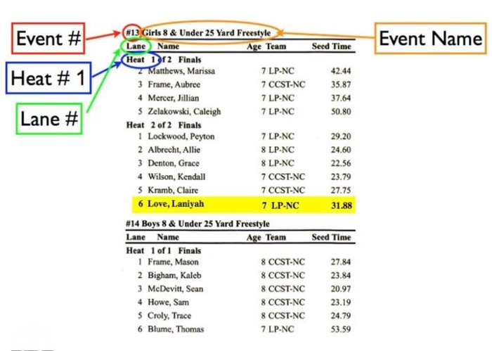 1. It is important for any swimmer to know what event numbers they are swimming prior to the warmups...have at least the event numbers and what they are swimming so that they can prepare properly for the day. They may also swim directly after the warmups and so they need to again be prepared for the events of the day.
